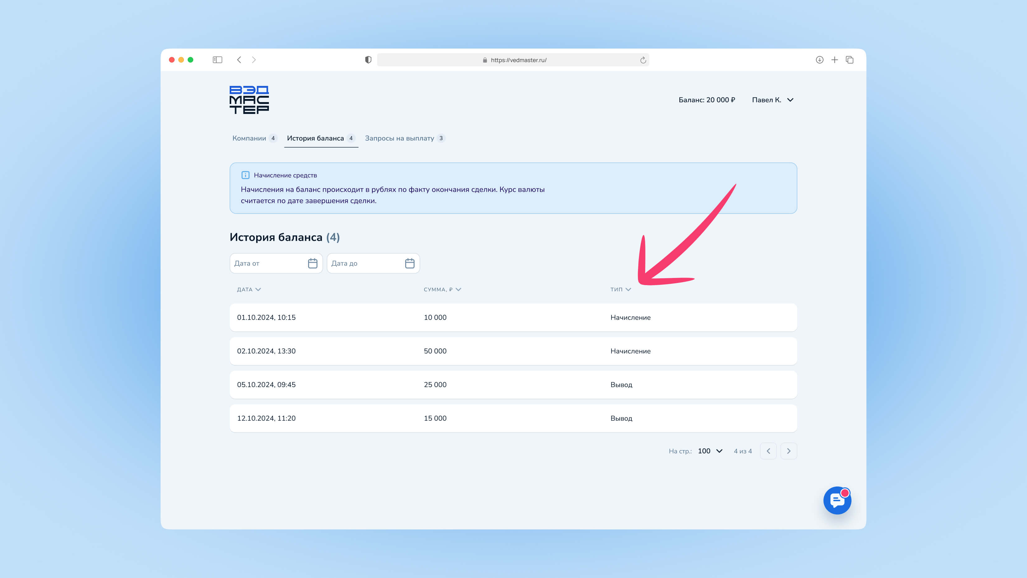 | Тип | Начисление или Вывод |