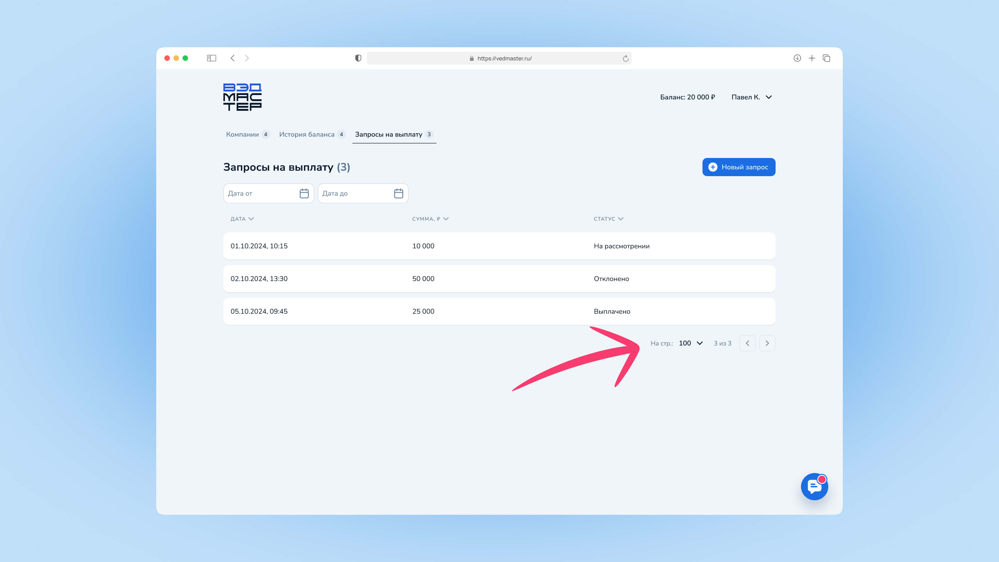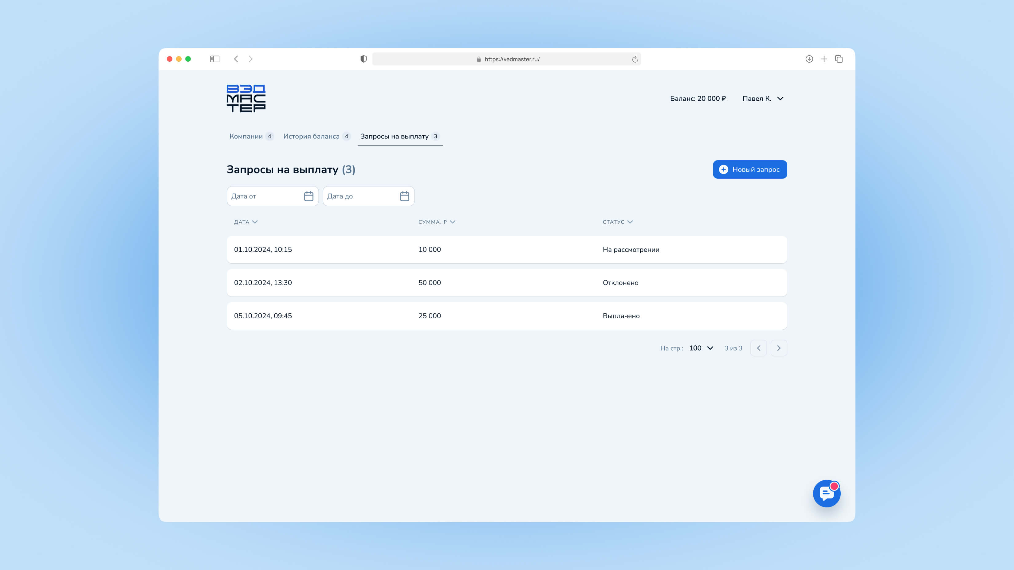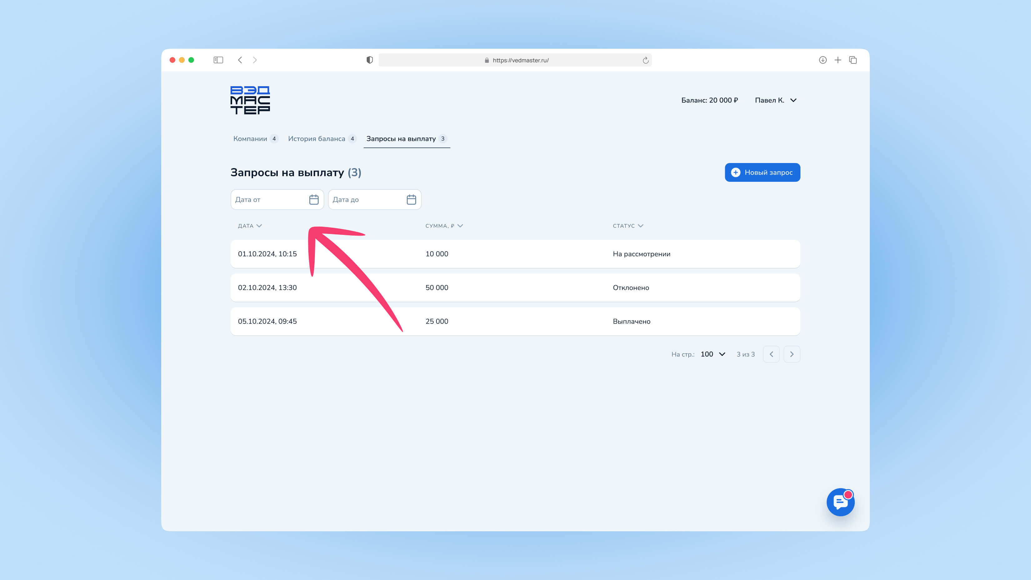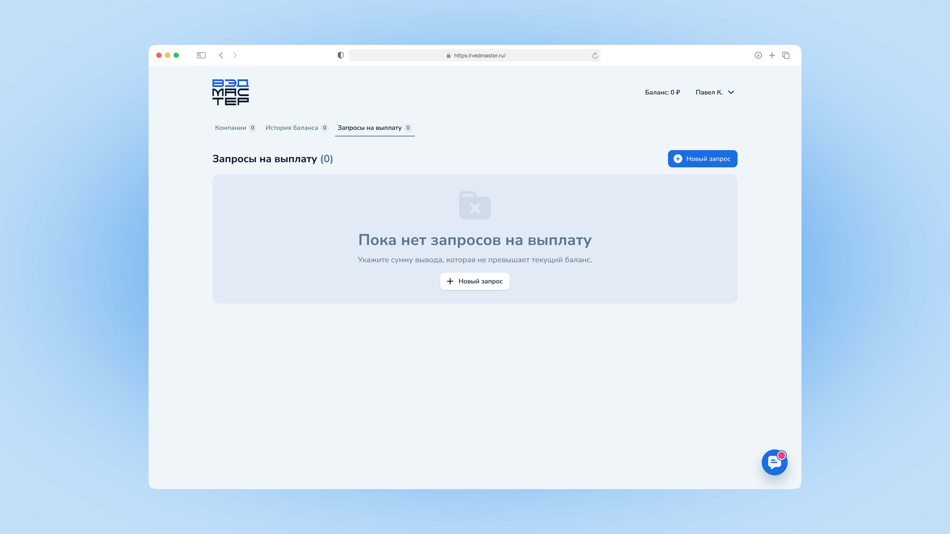Вкладка «Запросы на выплату» позволяет создавать заявки на вывод агентского вознаграждения и отслеживать их обработку.