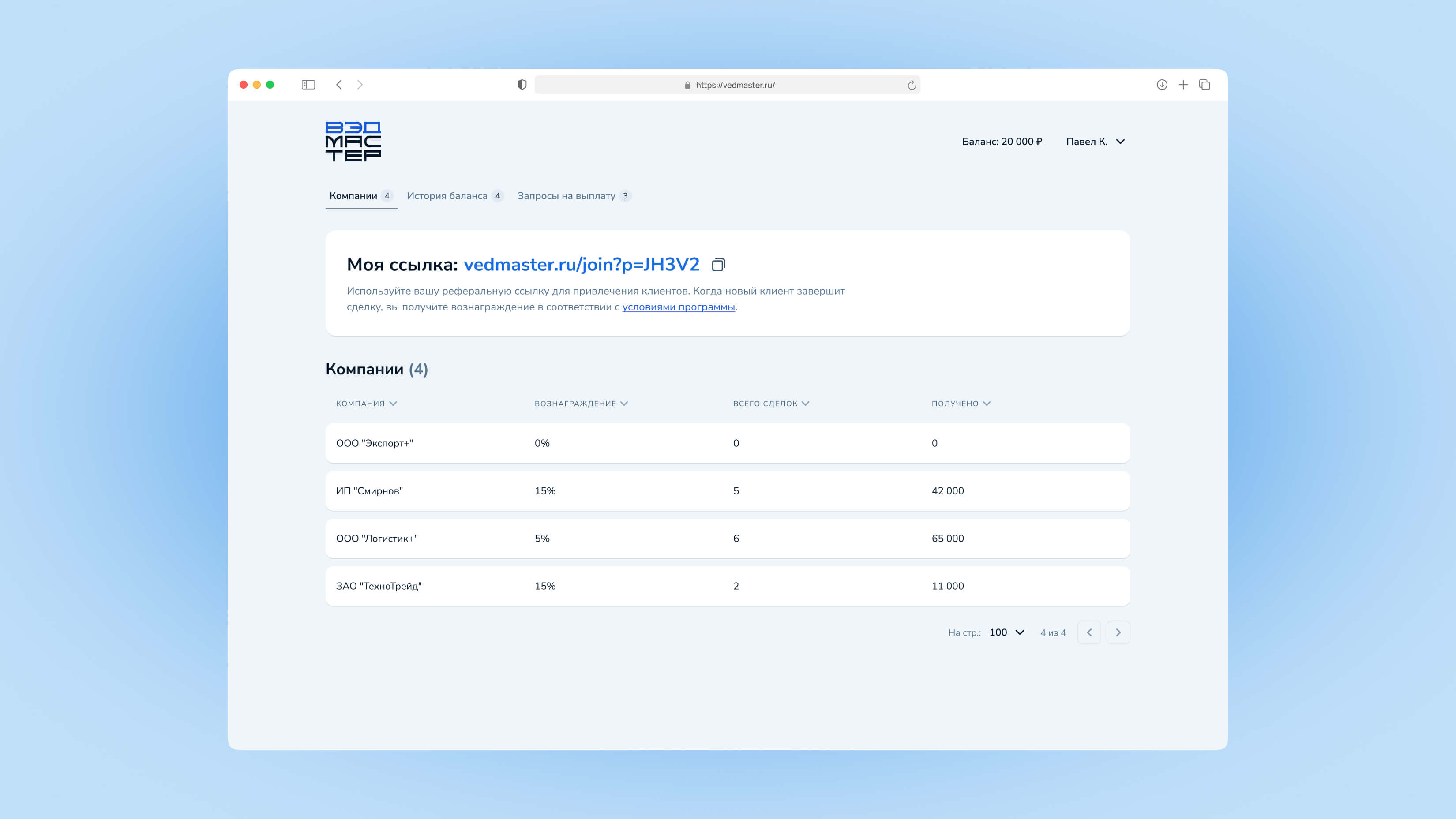 На этой вкладке отображаются все компании, зарегистрированные по вашей реферальной ссылке.