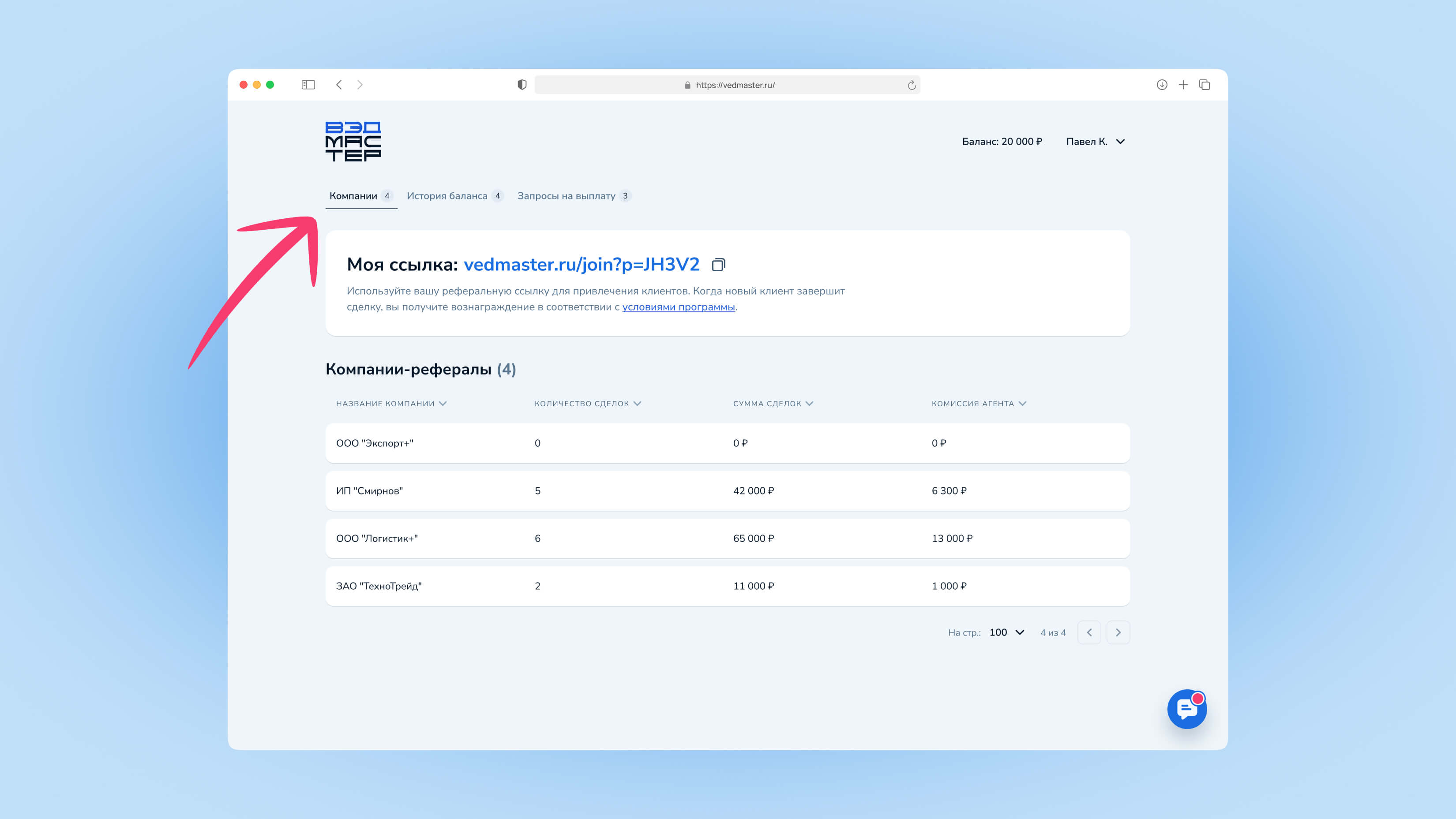 Реферальная ссылка — это ваш уникальный URL для привлечения новых клиентов. Когда компания регистрируется по вашей ссылке, она автоматически привязывается к вашему агентскому аккаунту.