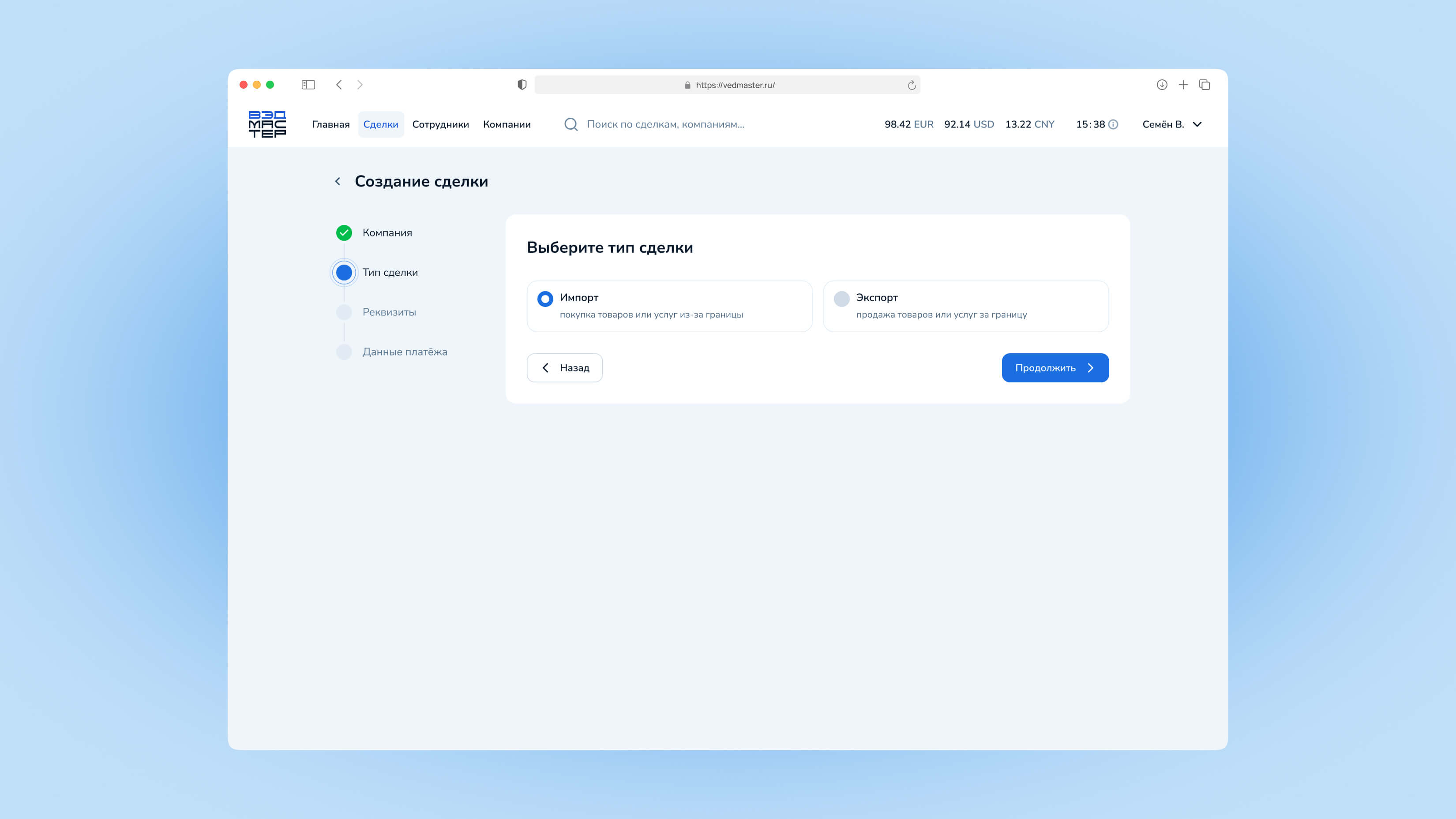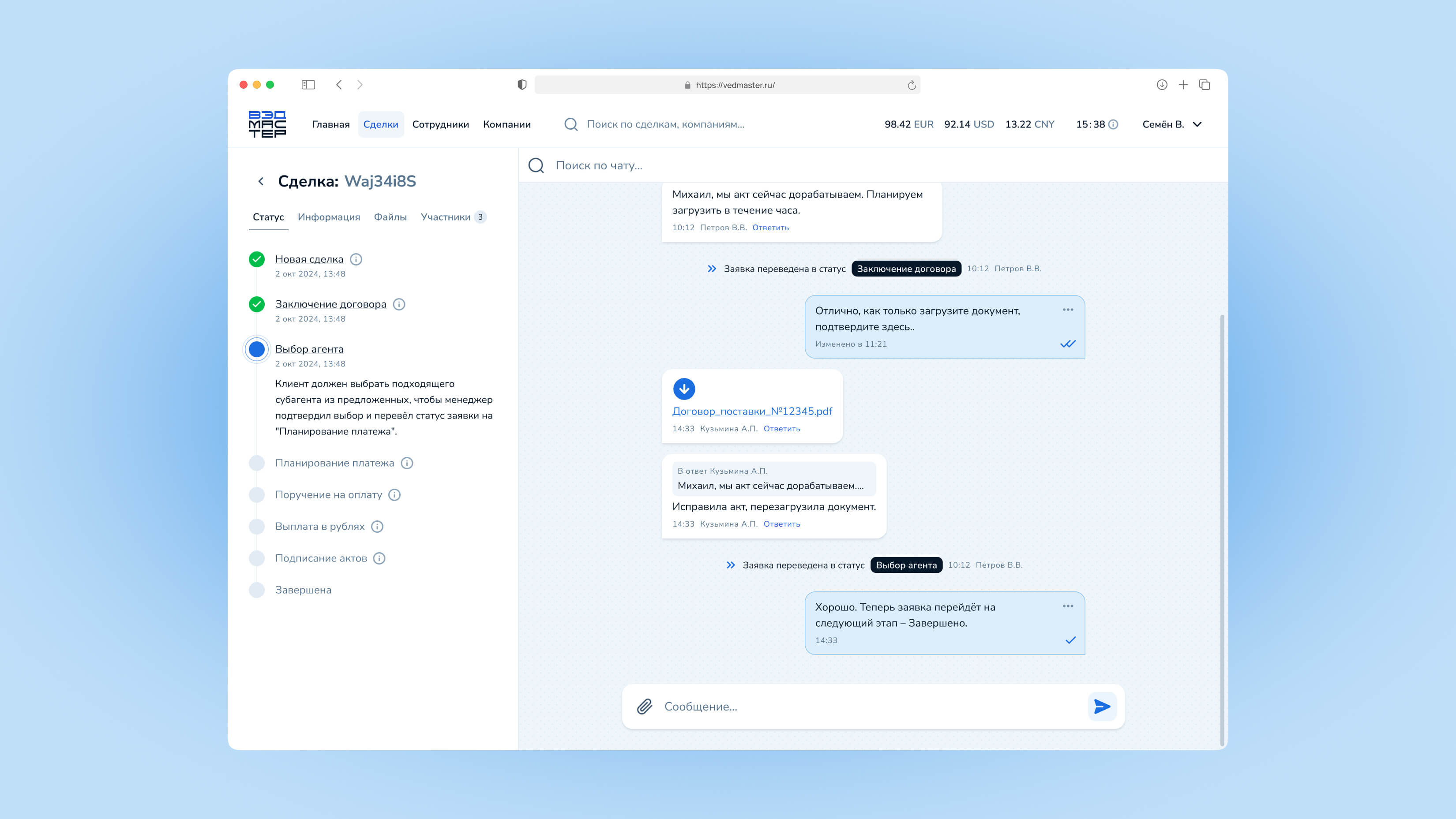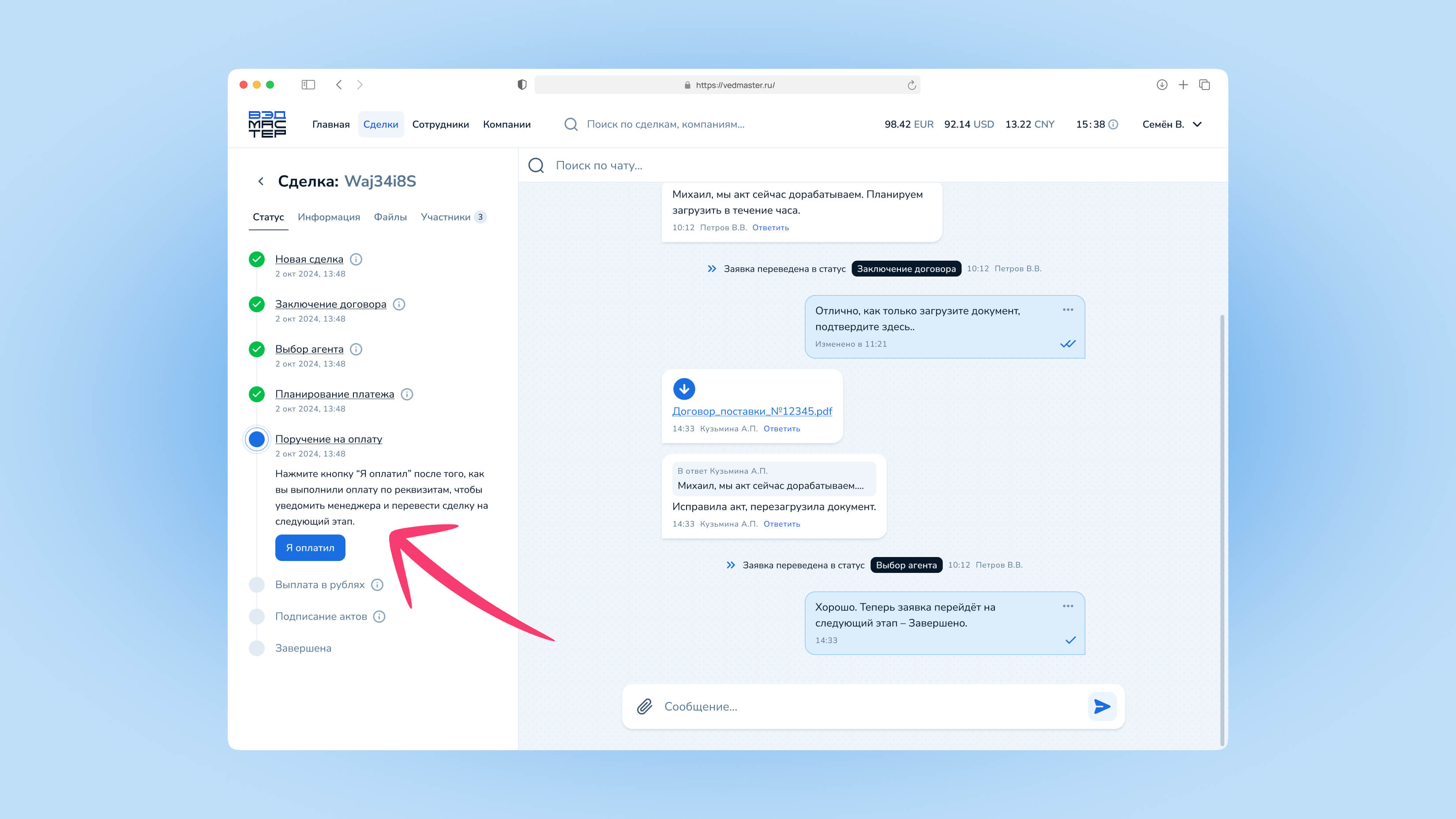 Сделка — это основной объект работы в системе VedMaster. Через сделки осуществляются все валютные операции: импортные платежи и возврат экспортной выручки. В этом руководстве вы узнаете, как создавать сделки, отслеживать их статус и взаимодействовать с менеджерами.