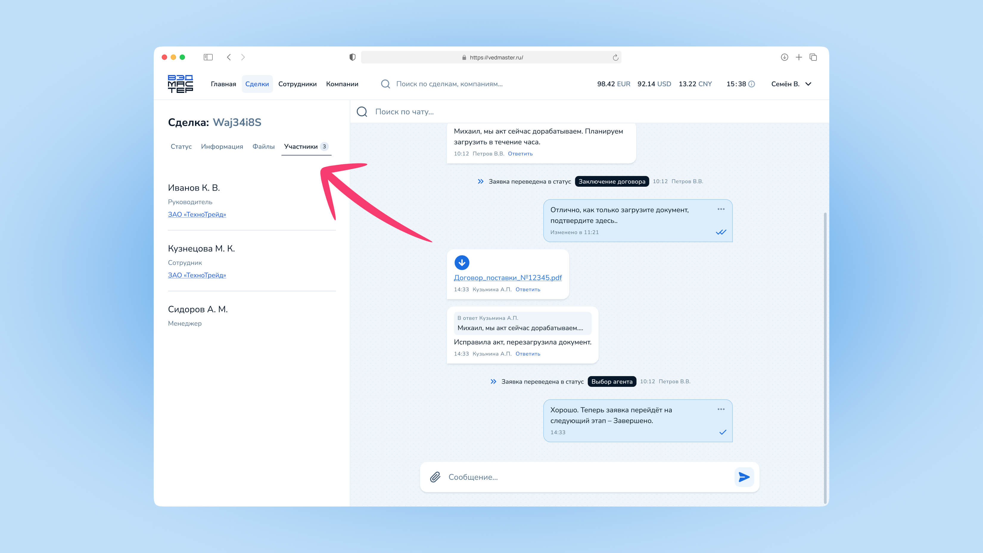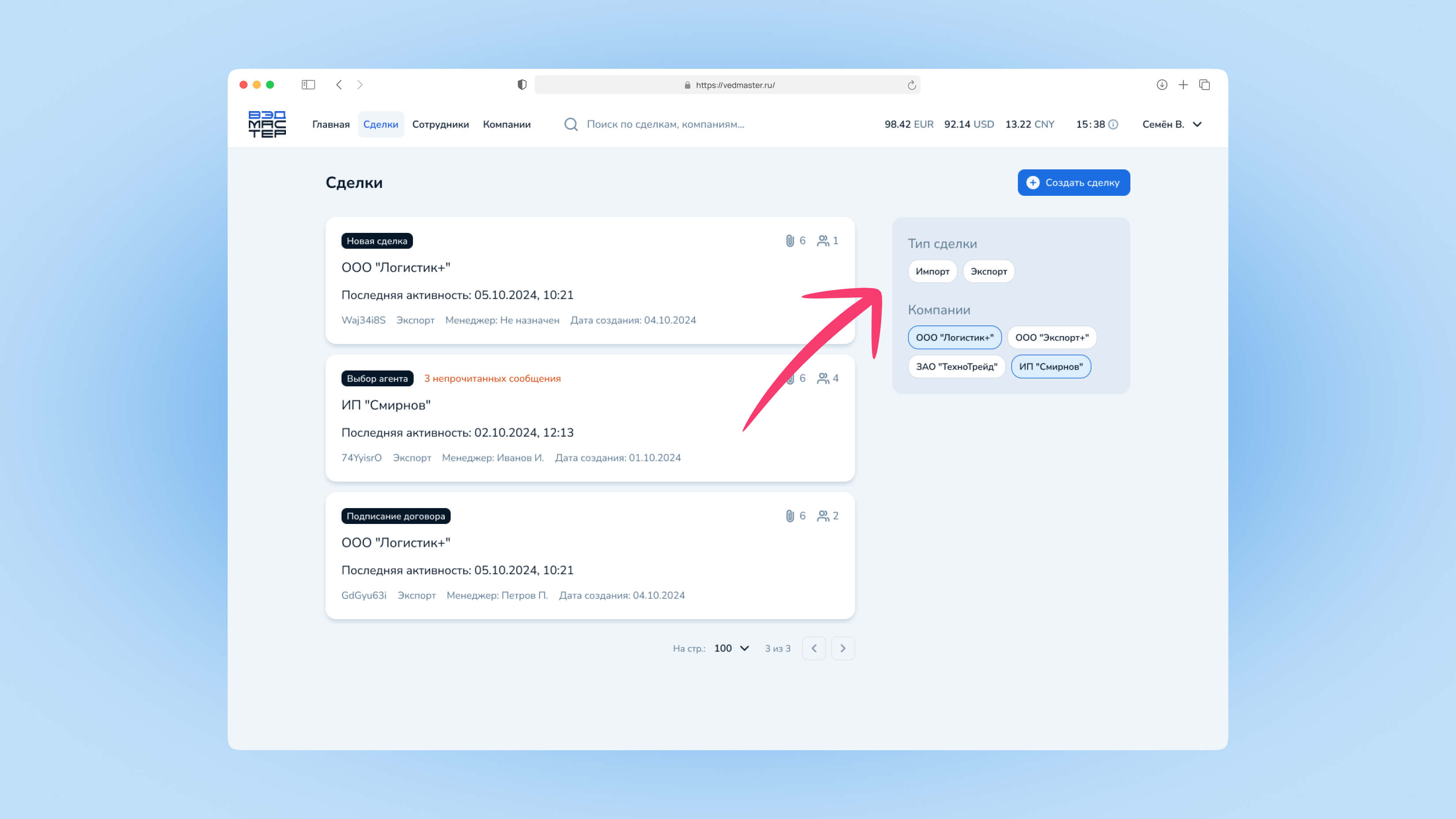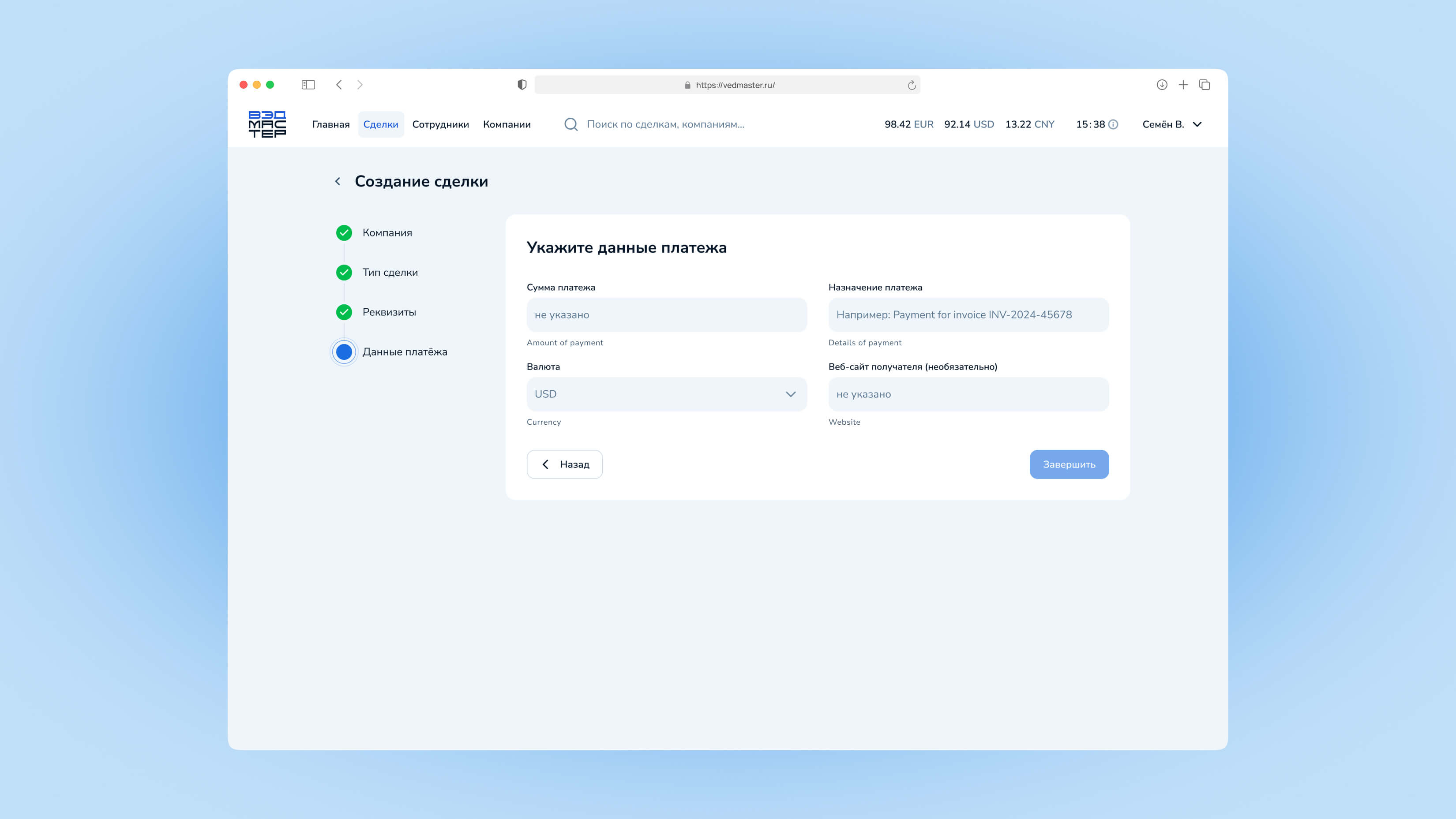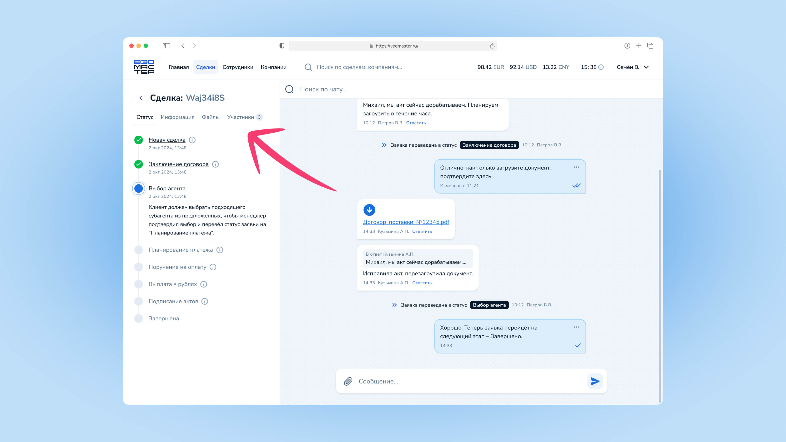 Сделка — это основной объект работы в системе VedMaster. Через сделки осуществляются все валютные операции: импортные платежи и возврат экспортной выручки. В этом руководстве вы узнаете, как создавать сделки, отслеживать их статус и взаимодействовать с менеджерами.