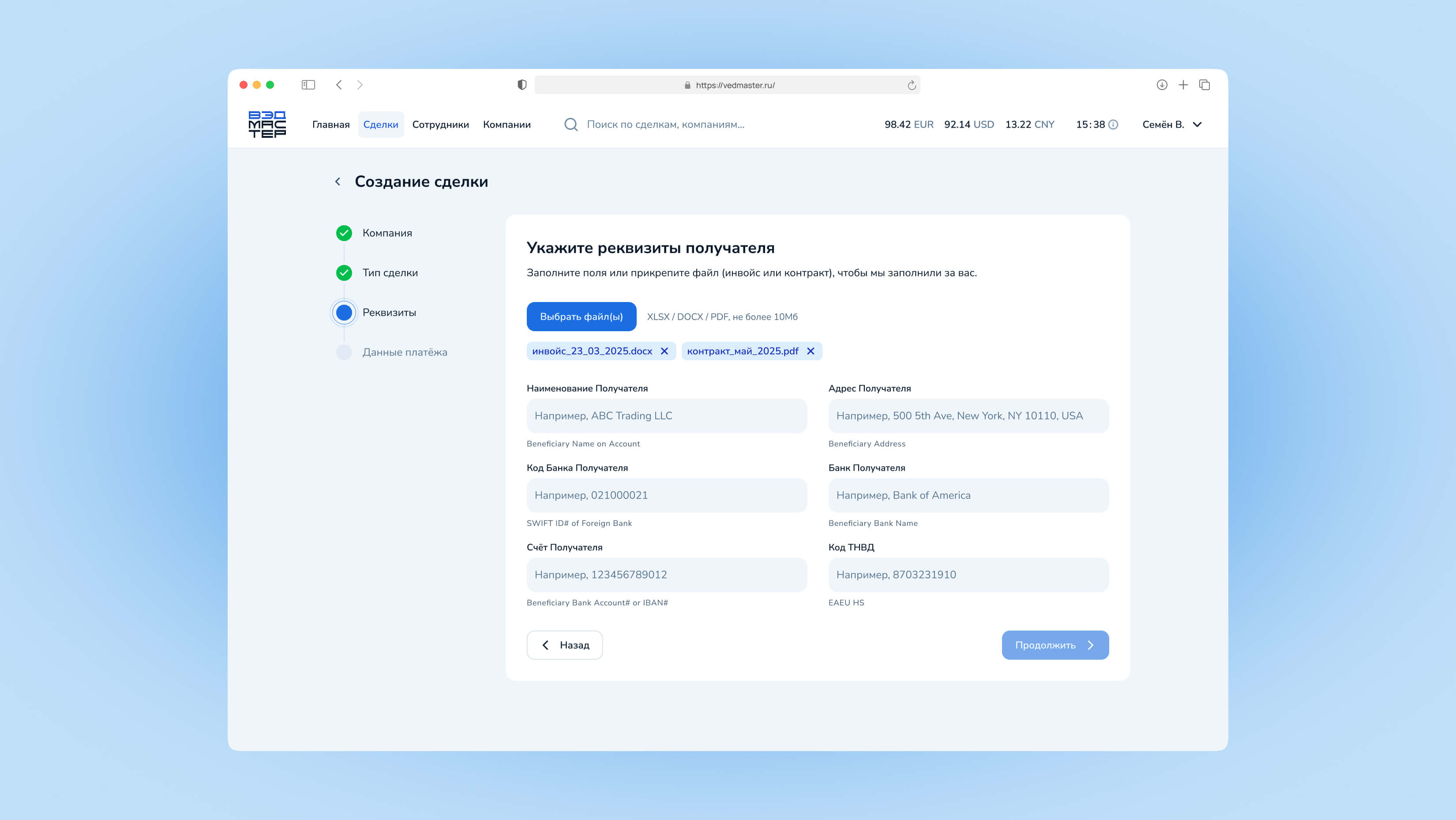 Вы можете загрузить инвойс или контракт (XLSX, DOCX, PDF до 10 МБ), и система автоматически заполнит часть полей.