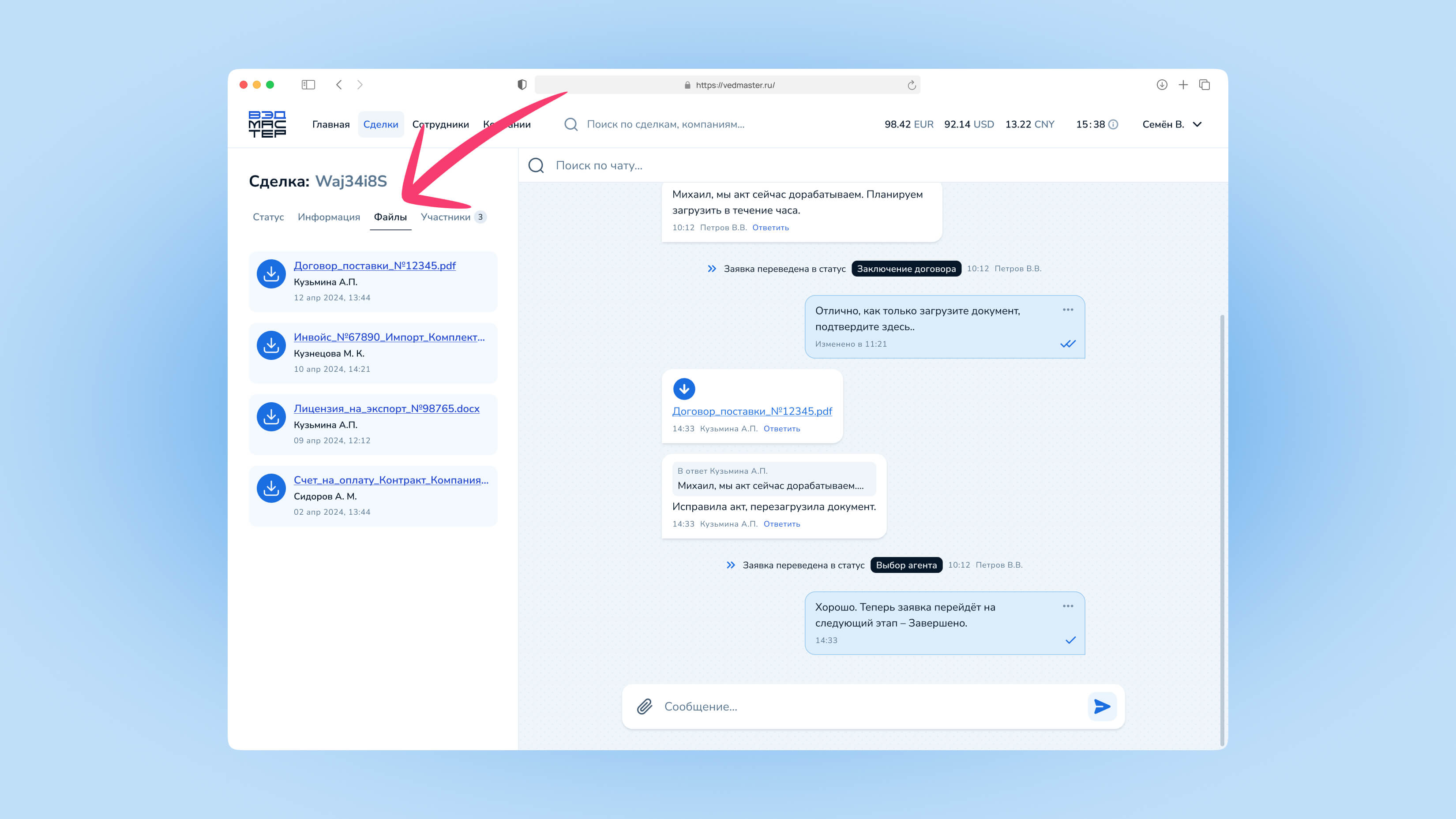 Файлы загружаются при создании сделки (инвойсы, контракты) и в процессе переписки в чате.