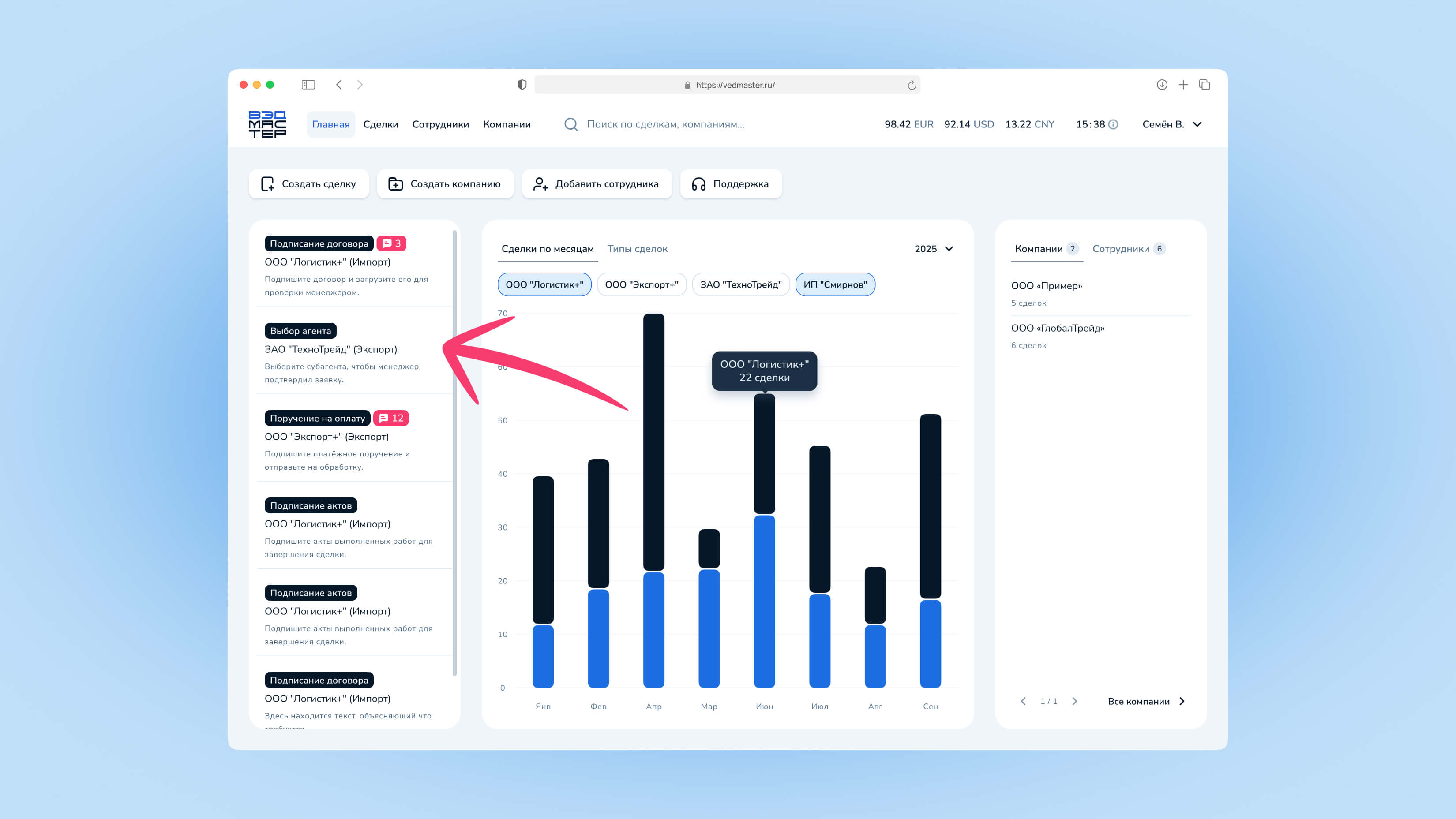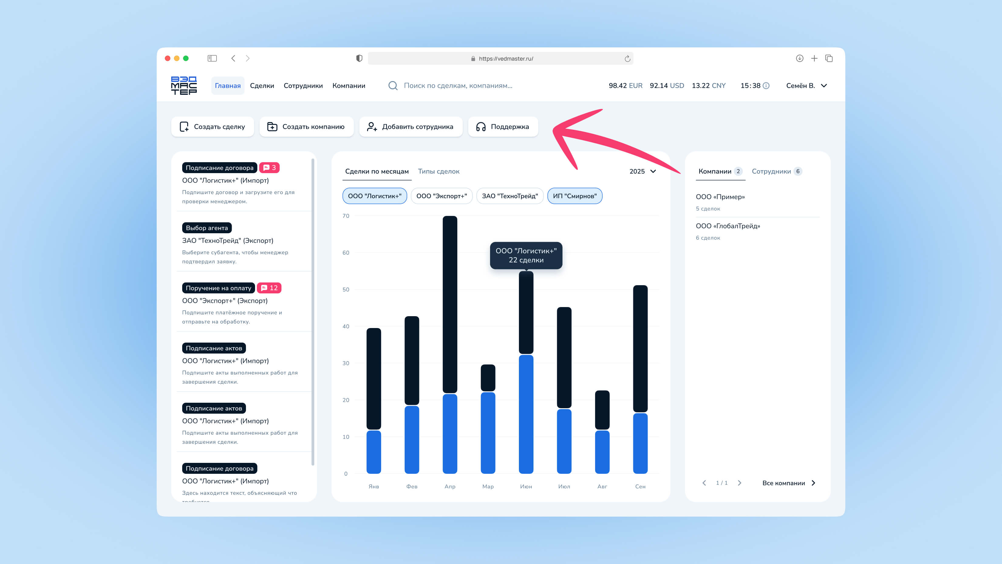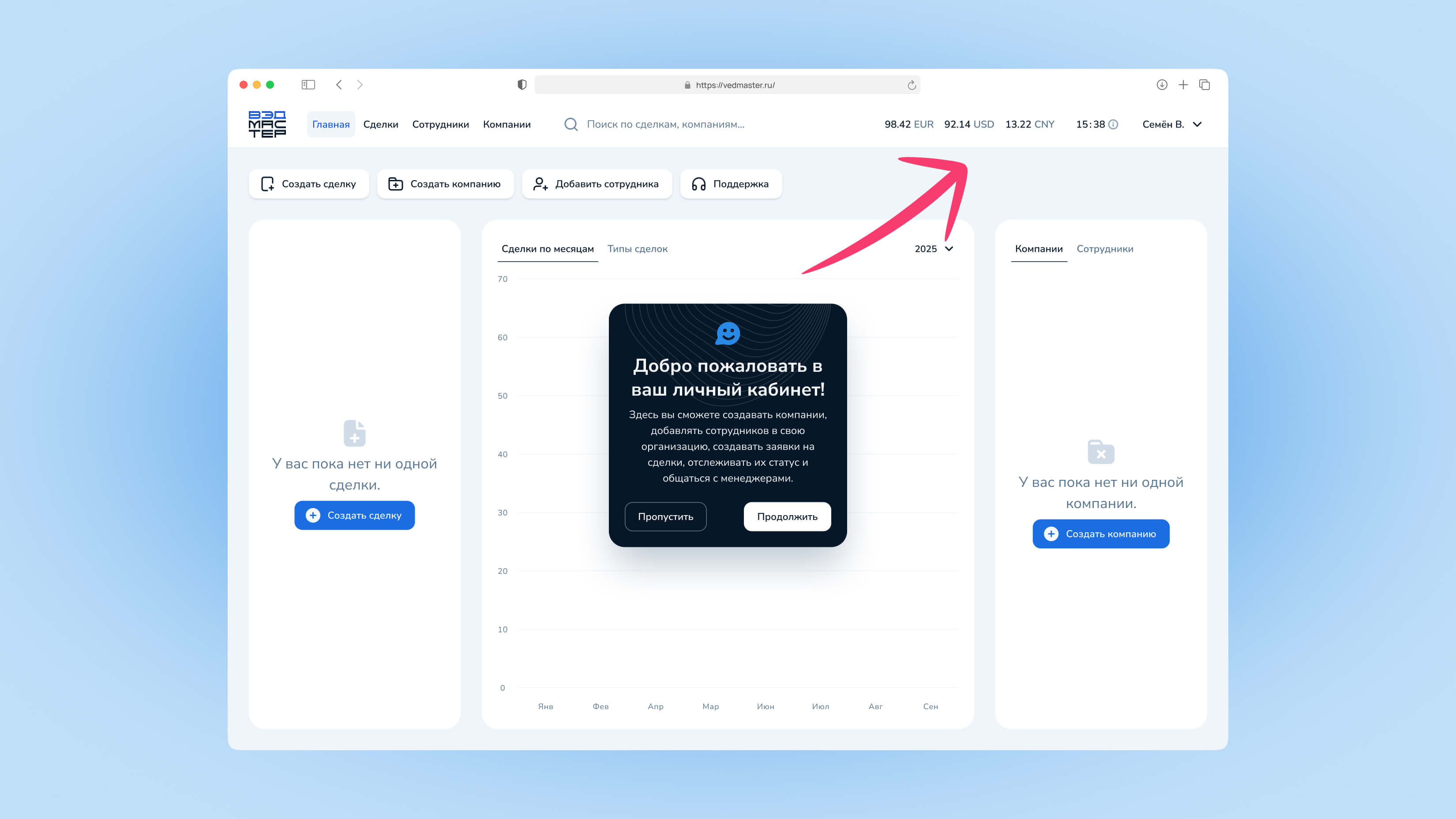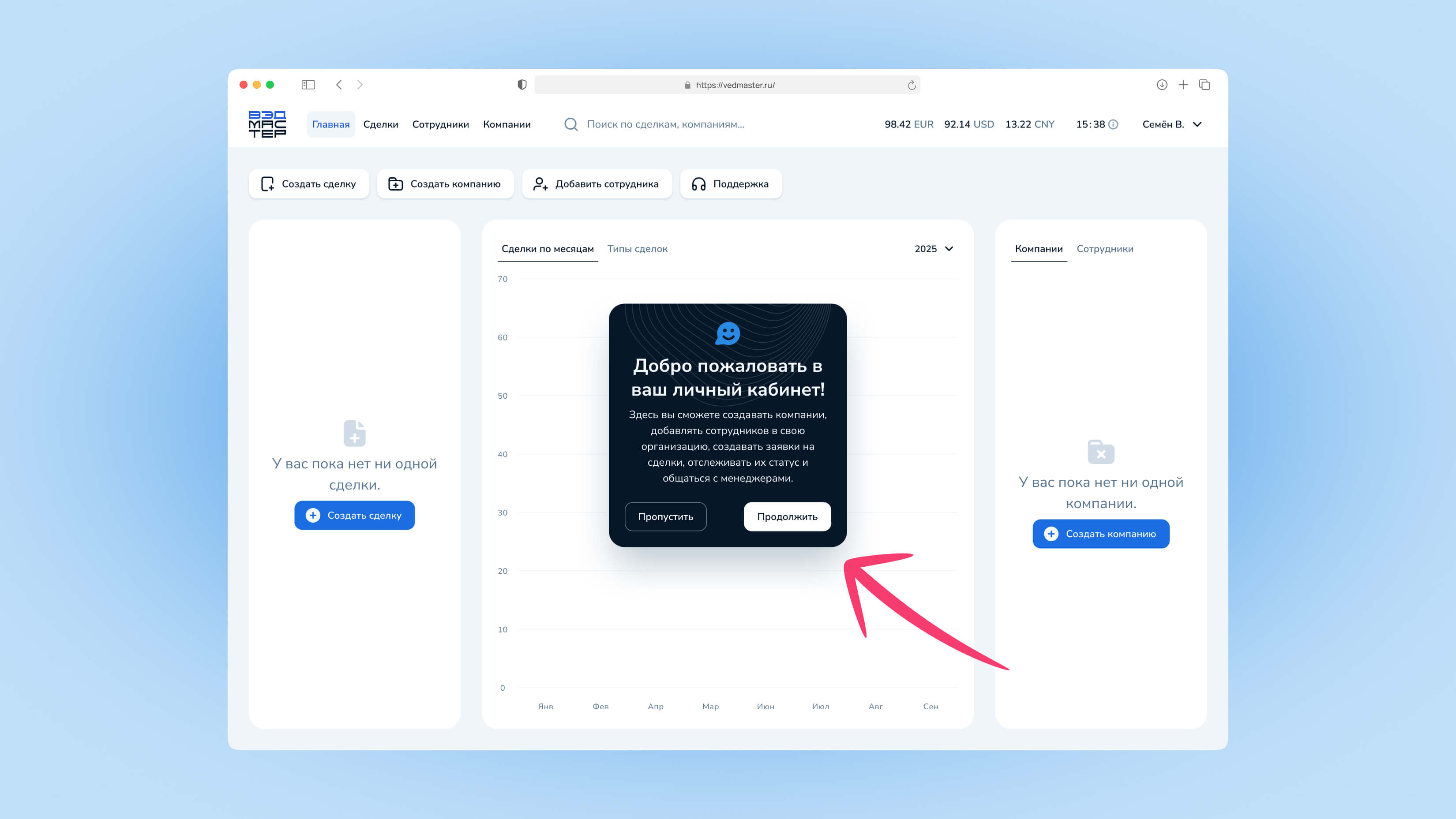 После входа в систему вы попадаете на главную страницу личного кабинета. Здесь собрана вся ключевая информация: ваши активные сделки, статистика, компании и сотрудники.